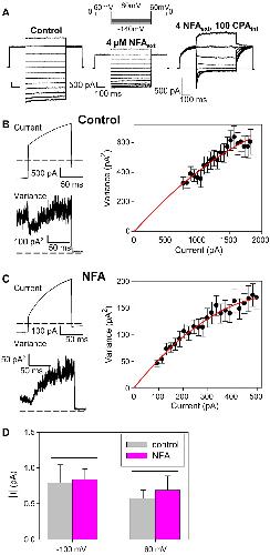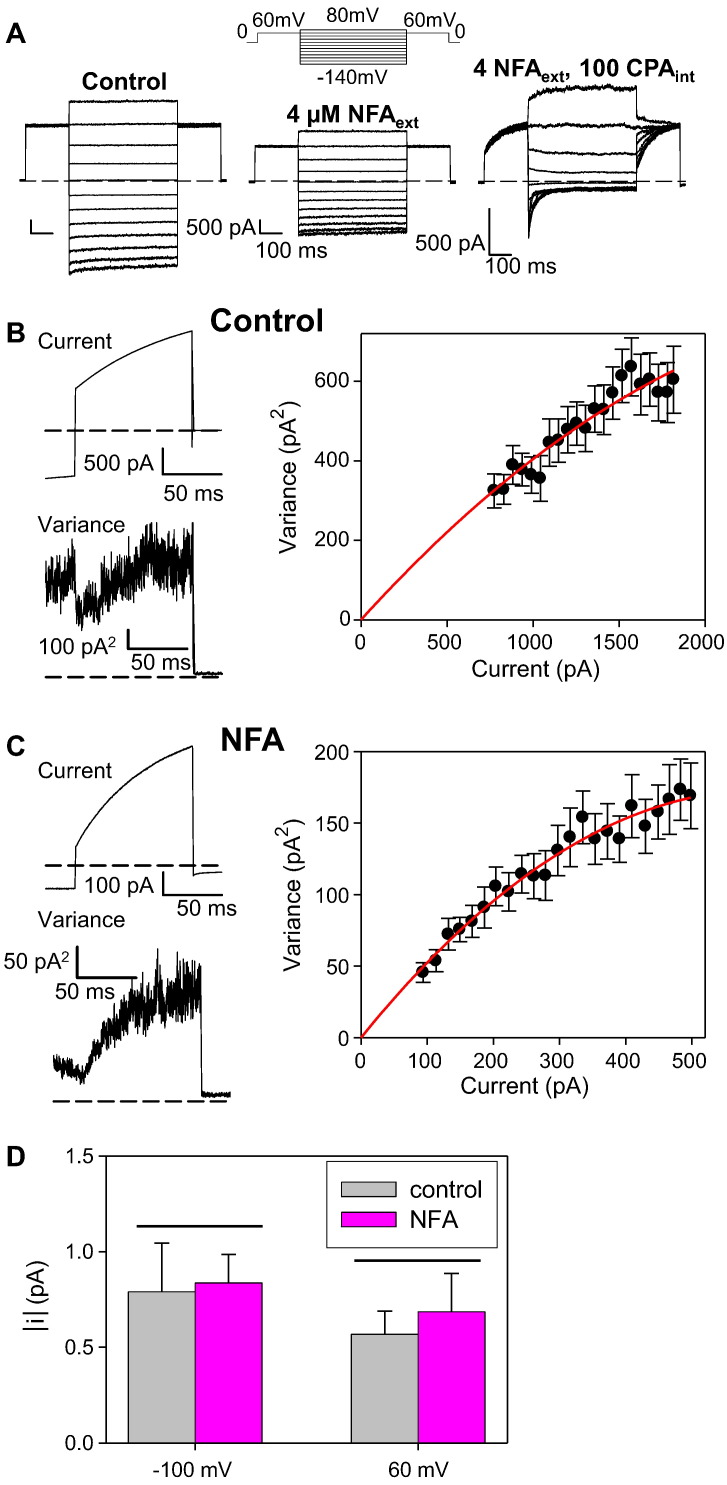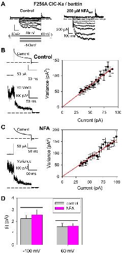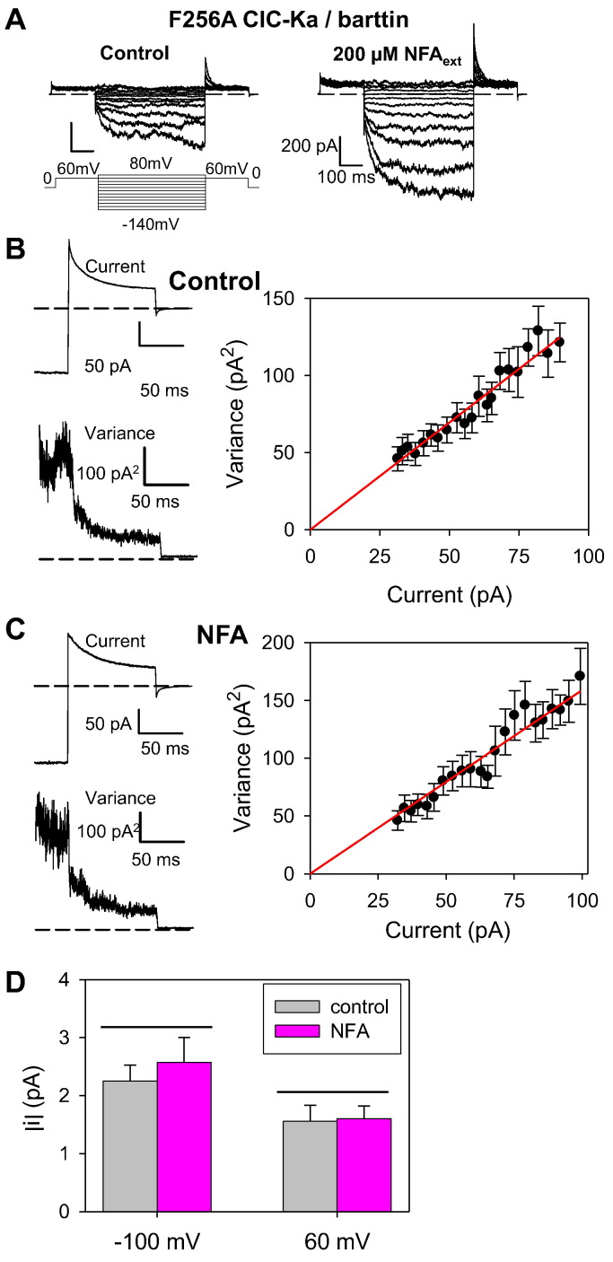Fig. 3. Non-stationary noise analysis of F256A CLC-Ka. (A) Typical current traces recorded by patch clamp in configuration inside-out from different oocytes without NFA (left) and with 200 μM NFAext (right) evoked by the stimulation protocol (bottom). (B–C) Examples of non-stationary noise analysis of F256A CLC-Ka in standard conditions (B) and in the presence of 200 μM NFAext (C) at 60 mV. (left). Mean currents (upper) and variance (lower) are shown as a function of time. Right: Variance (symbols) is plotted versus the mean current and fitted with a parabola (red line) as described in the Materials and methods section. (D) Bars represent the absolute value of the single channel mean current in control solution and at 200 μM NFAext at two different potentials (− 100 mV and 60 mV) (n ≥ 4), p > 0.2 (unpaired Student's t-test) (background variance and leak currents were subtracted).