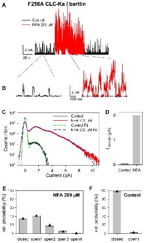 Fig. 4. NFA increases the open probability of F256A CLC-Ka. Example of single channel recordings and analysis from a single patch (similar experiments allowing the estimation of the number of channels: n = 3; 2 additional patches with larger currents were allowed to estimate the degree of potentiation but not the number of channels). (A) Continuous recording from F256A CLC-Ka at 60 mV. Different colors represent the external solutions applied during the experiment (black: control, red: 200 μM NFA). (B) Portions of the recording in (A) shown at higher time resolution. (C) The amplitude histogram of the recording at 60 mV in control solution (black trace) and in the presence of 200 μM NFA (red trace). Fit curves are superimposed as dashed lines. (D) Mean current from the recording in (A) measured at 60 mV for 40 s in control solution and in 200 μM NFA. (E–F) Probabilities of the conductance states in 200 μM NFA and in control solution. The measured state probabilities are shown as bars, whereas the symbols are the expected values from the binomials fits (see the Materials and methods section) resulting in N = 5 channels, p = 20% in NFA and p = 0.3% in control (for the fit in control, the number of channels was fixed to 5, as obtained in the presence of NFA).