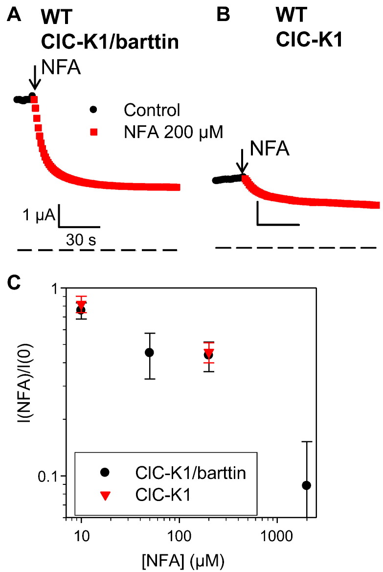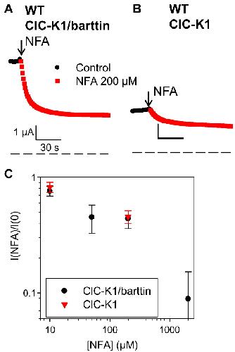 Fig. 5. WT CLC-K1 is blocked by NFA both with and without barttin. Effect of 200 μM NFA on WT CLC-K1/barttin (A) and WT CLC-K1 (B). Currents are plotted as function of the time. Colors and symbols correspond to the different solutions applied during the experiment. (C) Dose response of NFA effect on WT CLC-K1 with and without barttin. Currents normalized to those recorded in standard solution are plotted versus [NFA]ext (concentrations tested on CLC-K1/barttin: 10, 50, 200, 2000 μM, n ≥ 3; concentrations tested on CLC-K1: 10, 200 μM, n ≥ 3).