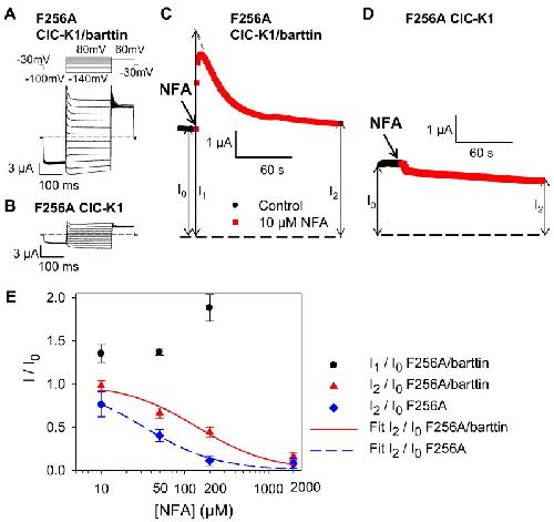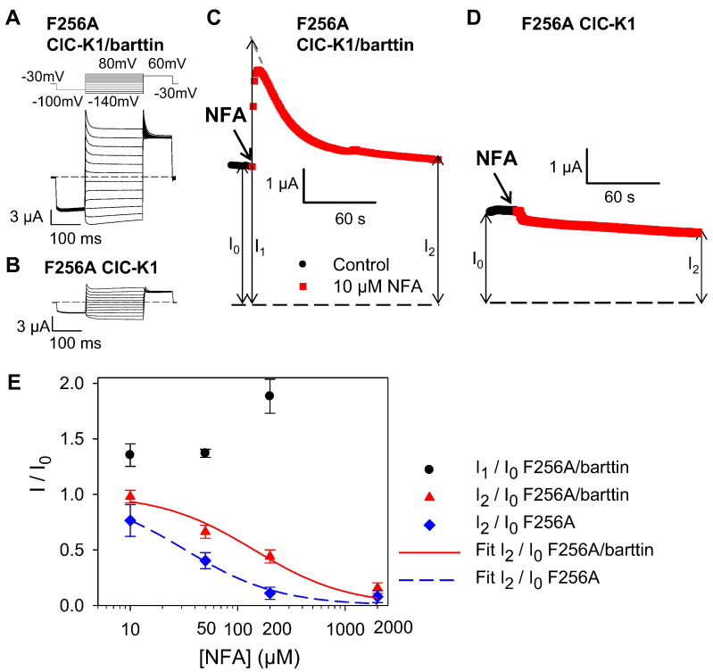 Fig. 6. Barttin involvement in the potentiation of F256A CLC-K1. Voltage-clamp traces of F256A CLC-K1/barttin (A) and F256A CLC-K1 (B) evoked by the IV-protocol in standard solution. (C–E) NFA effect on F256A CLC-K1 expressed with barttin or by itself in Xenopus oocytes. Current of F256A CLC-K1/barttin (C) and F256A CLC-K1 (D) at 60 mV is shown as function of time. Colors and symbols correspond to the solutions applied. Vertical arrows indicate the initial current (I0), the maximal NFA potentiation extrapolated by a single-exponential function (I1), and the steady state current (I2). (E) Dose–response relationship of NFA potentiation of F256A/barttin CLC-K1 and NFA inhibition of F256A CLC-K1/barttin and F256A CLC-K1. I1/I0 and I2/I0 are plotted versus [NFA]ext (used concentrations: 10, 50, 200, and 2000 μM, n ≥ 3). The lines represent the fit curves obtained from the equation I2 / I0 = 1 / (1 + (c / KD)) for NFA block of F256A/barttin (KD ~ 142 μM) and F256A (KD ~ 33 μM).