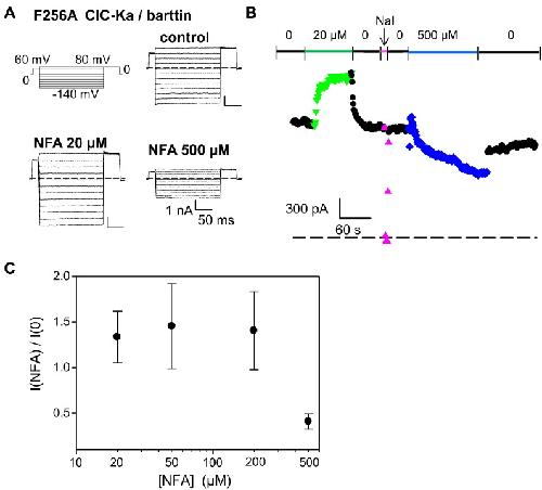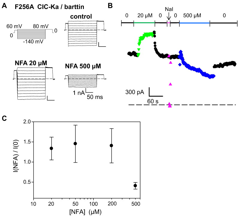 Fig. 7. NFA potentiation and block of F256A CLC-Ka in HEK293 cells. (A) Representative current recordings of F256A CLC-Ka/barttin expressed in HEK293 cells in control solution (top right), at 20 μM NFA (bottom left) and at 500 μM NFA (bottom right). (B and C) Effect of [NFA]ext on F256A CLC-Ka. (B) Mean current at 60 mV is plotted vs. time. Colors and symbols correspond to the [NFA]ext applied (0, 20, and 500 μM). (C) Normalized currents acquired at different [NFA]ext are plotted vs. [NFA]ext (used concentrations: 20, 50, 200, and 500 μM) (n ≥ 4 for 20, 50, and 500 μM; n = 17 for 200 μM).