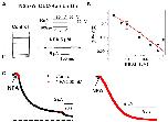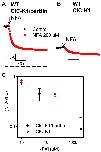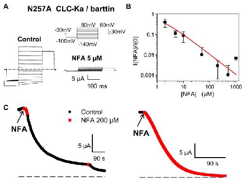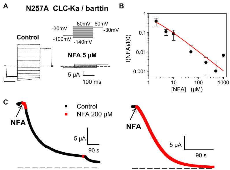 Fig. 8. Dramatic inhibition of N257A CLC-Ka by NFA. (A) Typical currents of N257A CLC-Ka expressed in Xenopus oocytes in control solution (left) and at 5 μM NFA (right). (B) Dose–response relationship of NFA effect on N257A CLC-Ka. Normalized currents are plotted vs. [NFA]ext (used concentrations: 2, 5, 10, 50, 200, 500, and 1000 μM) (n ≥ 4 except n = 3 for 1000 μM). The red line represents the fit curve obtained from the equation I / I0 = 1 / (1 + (c / KD)) with KD ~ 1 μM. (C) Insensitivity to washing of N257A CLC-Ka inhibition. Mean currents plotted as function of time after a short NFA perfusion (left) (similar experiments n = 4) or a longer NFA perfusion (right) (similar experiments n = 10). Colors and symbols represent the solutions applied.