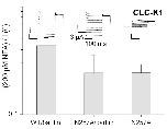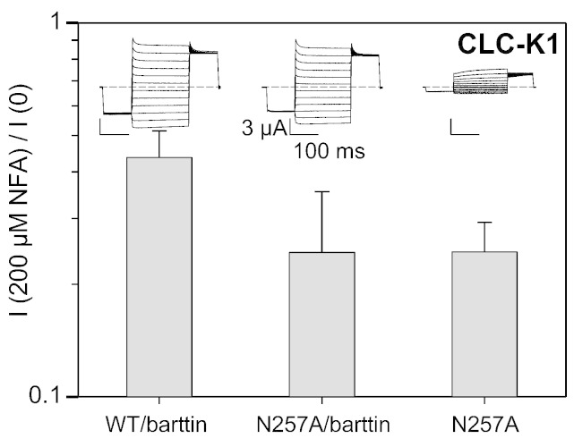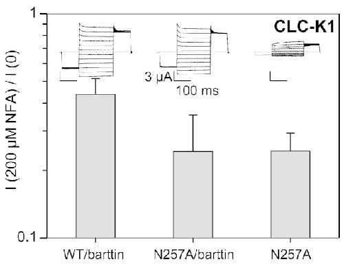 Fig. 11. NFA affinity of N257A CLC-K1 is comparable to that of WT CLC-K1. Comparison of normalized currents of WT CLC-K1/barttin (n = 5), N257A/barttin (n = 3), and N257A (n = 5) at 200 μM NFA normalized to the current recorded in control condition. On top of the figure typical current traces of WT/barttin, N257A/barttin, and N257A CLC-K1 (from left to right).