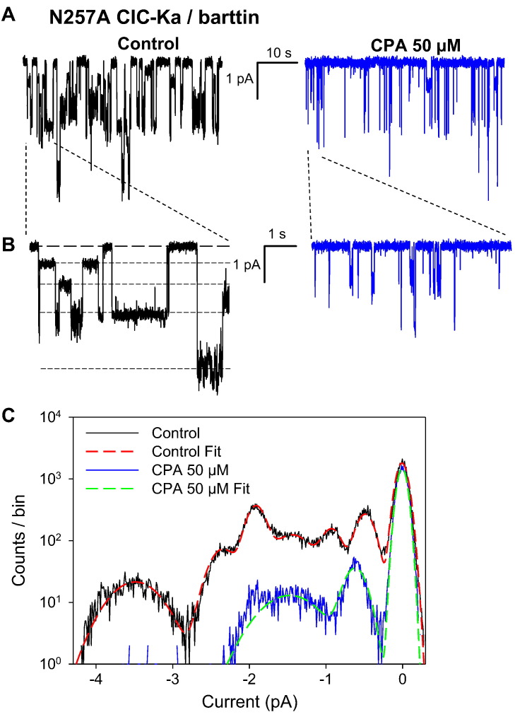 Fig. 10. Single channel recordings from N257A CLC-Ka. (A) Representative traces from a single patch at − 100 mV in internal control solution and in 50 μM CPA (similar experiments n = 5). (B) Short stretches of the traces in (A) shown at a higher time resolution. In the left panel dashed lines indicate several distinct conductance levels. (C) Amplitude histogram of the recording at − 100 mV in control solution and in the presence of 50 μM CPA. Dashed lines are fit curves superimposed. In the presence of CPA the dominant current level has an amplitude of 0.66 pA. There is no clear correspondence between the peaks in control and in CPA.