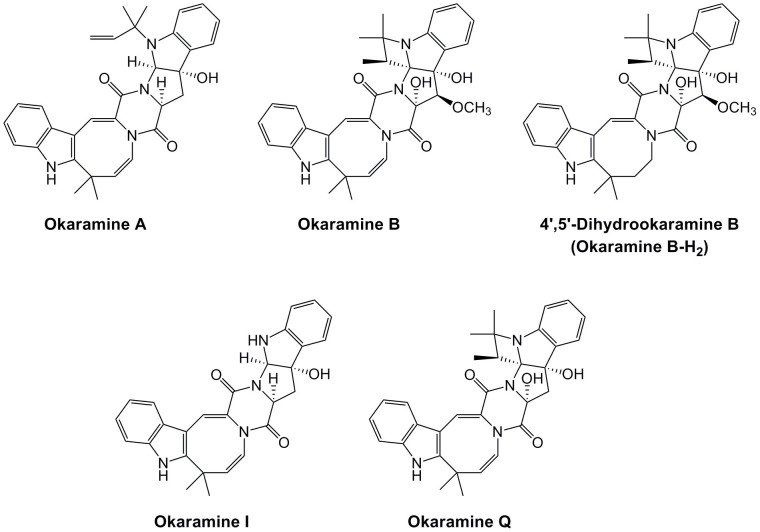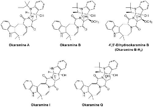 Figure 1. Structures of okaramines A, B, 4′,5′-dihydrookaramine B (okaramine B-H2), I and Q.