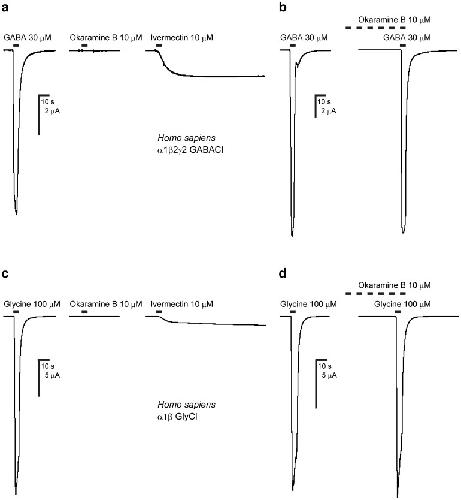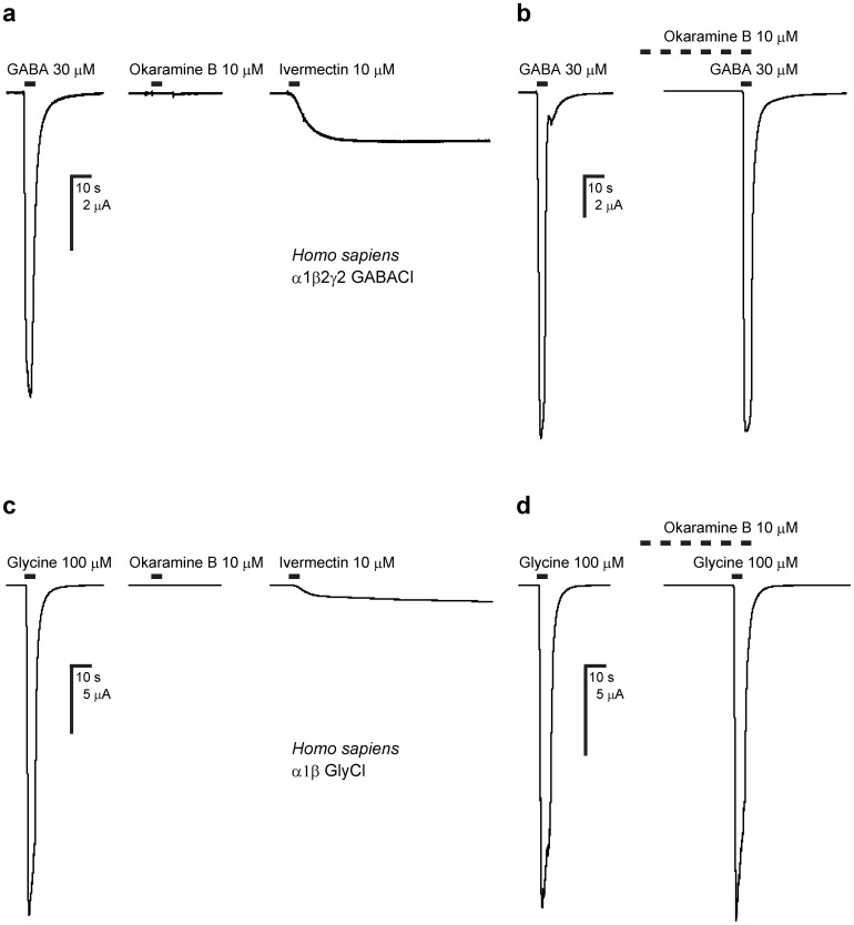 Figure 4. Actions of okaramine B on human α1β2γ2 GABACl and α1β glycine-gated chloride channel (GlyCl) expressed in Xenopus laevis oocytes.(a) Three minutes after recording a response to 30 μM GABA, 10 μM okaramine B was bath-applied to oocytes expressing the human α1β2γ2 GABACl. After 3 min wash, 10 μM ivermectin was bath-applied. (b) Okaramine B (10 μM) was pre-applied for 1 min prior to co-application with 30 μM GABA to the α1β2γ2 GABACl. (c) Three minutes after recording a response to 100 μM glycine, 10 μM okaramine B was bath-applied to oocytes expressing the human α1β GlyCl. After 3 min wash, 10 μM ivermectin was bath-applied. (d) Okaramine B (10 μM) was pre-applied for 1 min prior to co-application with 100 μM glycine to oocytes expressing the α1β GlyCl. All the results were reproducible (n = 4).