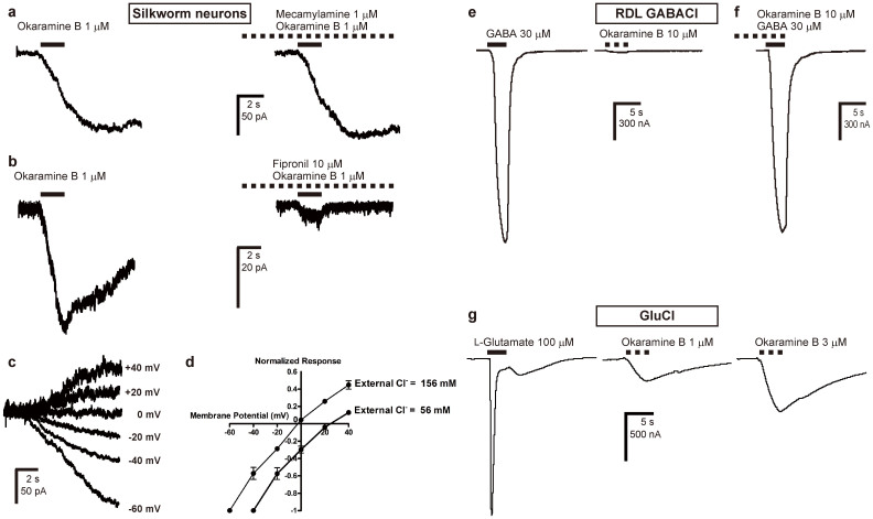 Figure 2. Action of okaramine B on the membrane currents of silkworm larval neurons as measured with whole-cell patch-clamp electrophysiology (a–d) and on silkworm larval RDL γ-aminobutyric-acid-gated chloride channel (GABACl) (e, f) and L-glutamate-gated chloride channel (GluCl) (g) expressed in Xenopus laevis oocytes as measured with two-electrode voltage-clamp electrophysiology.Okaramine B was applied via U-tube, whereas antagonists were bath-applied to the neurons. (a) Inward current induced by okaramine B at 1 μM and the effect of nicotinic receptor antagonist mecamylamine (1 μM) applied for 1 min prior to co-application with 1 μM okaramine B. (b) Inward current induced by okaramine B at 1 μM and the effect of ligand-gated chloride channel blocker fipronil (10 μM) applied for 1 min prior to co-application with 1 μM okaramine B. (c) Inward current induced by 1 μM okaramine B at various holding potentials. (d) Current-voltage relationship at two different extracellular chloride concentrations. Each plot indicates the mean ± standard error of repeated experiments (n = 3). (e) Five min after recording the response to 30 μM GABA of RDL, 10 μM okaramine was bath-applied. (f) Okaramine B was bath-applied at 10 μM for 1 min prior to co-application with 30 μM GABA. Okaramine B had a minimal impact on the GABA response RDL. (g) Five min after recording the response to 100 μM L-glutamate of GluCl, 1 and 3 μM okaramine B was bath-applied with at 5-min interval.