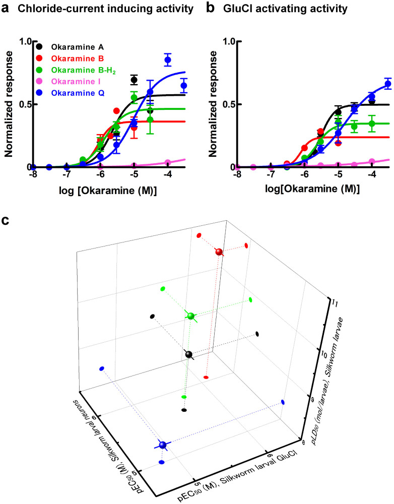 Figure 3. Concentration-response relationships of okaramines A, B, 4′,5′-dihydrookaramine B (okaramine B-H2), I and Q for the Cl− current inducing activity on the silkworm neurons and the GluCl activating activity, and correlations of these two activities with the insecticidal activity on the silkworm larvae.(a) Concentration-response relationship for the chloride-current inducing activity on the silkworm larval neuron. (b) Concentration-response relationship for the GluCl activating activity. Each plot indicates the mean ± standard error of the mean of repeated experiments (n = 4). (c) 3D plot for the relationship of the GluCl activating activity (X axis), and the Cl− current inducing activity on the larval neuron (Y axis) with the insecticidal activity (n = 3) (Z axis). Each sphere plot in (c) is projected to X-Y, X-Z and Y-Z planes to show its position in each plane.