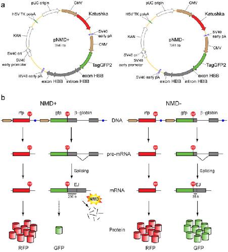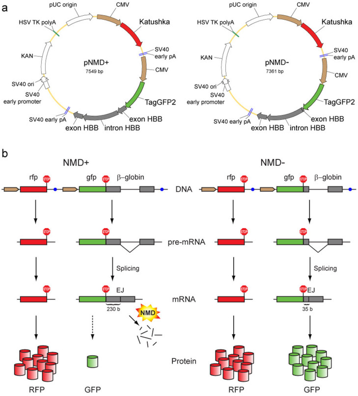 Figure 1. Scheme of the proposed method of NMD analysis.(a) Main elements in the reporter vectors pNMD+ (left) and pNMD− (right). Brown arrows – CMV promoters. Red arrows – Katushka coding region. Green arrows – TagGFP2 coding region. Grey arrows – human β-globin (HBB) gene fragment. (b) Schematic outline of the reporter function. The pNMD+ vector (left) carries two fluorescent proteins; one (GFP) is encoded by the NMD-targeted transcript, and the other (RFP) serves as an expression efficiency control. The pNMD− control vector (right) encodes both RFP and GFP by NMD-independent transcripts. Comparison of the green-to-red fluorescence ratios between pNMD+ and pNMD− samples allows for the calculation of NMD activity. Brown arrows – promoters. Red, green and grey rectangles – coding regions for RFP, GFP and β-globin, respectively. Blue circles – transcription terminators. Red ″STOP″ signs – stop codons. Red and green cylinders – translated GFP and RFP proteins.