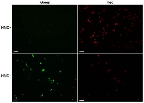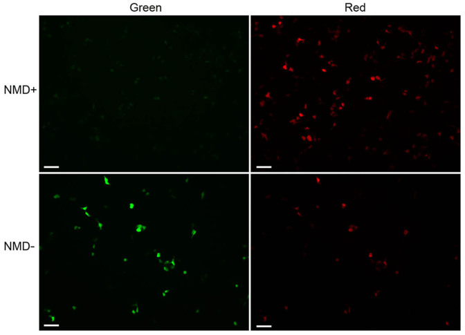 Figure 2. Fluorescence microscopy of HEK293T cells transiently expressing pNMD+ and pNMD−.Cells were imaged under the same settings. Scale bar: 100 μm.
