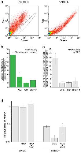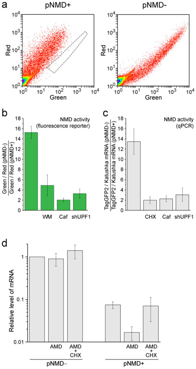 Figure 3. Performance of the splicing-dependent NMD reporter in HEK293T cells.(a) Flow cytometry analysis (dot plots in green and red channels) of the cells transiently transfected with pNMD+ (left plot) or pNMD− (right plot). Samples were analyzed using the same flow cytometer settings. To simplify the comparison, the area of pNMD− cells is outlined by a gray dashed line. (b,c) NMD activity determined by fluorescence reporter analysis (b) or quantitative PCR (c) of HEK293T cells transiently transfected with reporter plasmids. Note the strong inhibition of NMD by treatment of the cells with wortmannin (WM), caffeine (Caf), anti-UPF1 shRNA (shUPF1) and cycloheximide (CHX). (c) Assessment of the stability of NMD reporter TagGFP2-encoded mRNA. TagGFP2 mRNA levels were measured by qPCR using HEK293T cells transfected with pNMD− or pNMD+ that were either untreated, treated for 1 h with actinomycin D (AMD) or treated for 1 h with both AMD and CHX. All values were normalized to the untreated pNMD− sample (first column). The mean data of at least 3 independent experiments with the standard deviation are shown in all panels.