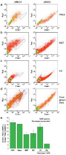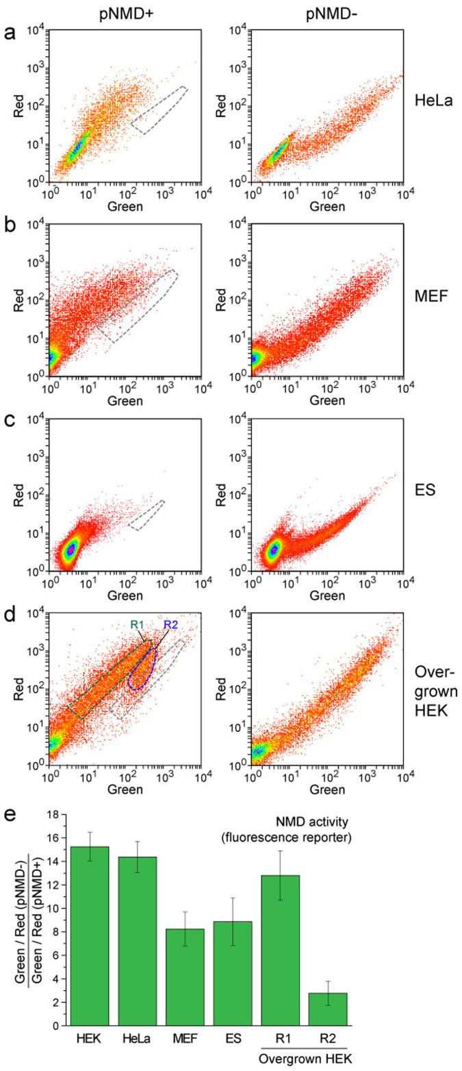 Figure 4. Splicing-dependent NMD reporter in different cell lines.(a–d) Flow cytometry analysis of the cells transiently transfected with pNMD+ (left plots) or pNMD− (right plots). Corresponding pairs of cell samples were analyzed using the same flow cytometer settings. The area of the corresponding NMD− cells is outlined by a gray dashed line on each NMD+ plot. (a) HeLa cells. (b) MEF cells. (c) ES cells. (d) Overgrown HEK293T cells. Note the clear heterogeneity of the NMD activity in these cells. Green and blue dashed lines show the cell populations R1 and R2 with different NMD activities. (e) NMD activity determined by the fluorescence reporter analysis in the designated cell lines. The mean data and standard deviation of at least 3 independent experiments are shown.