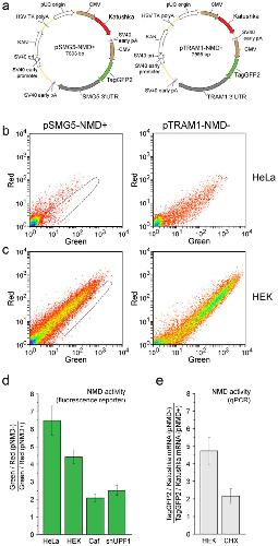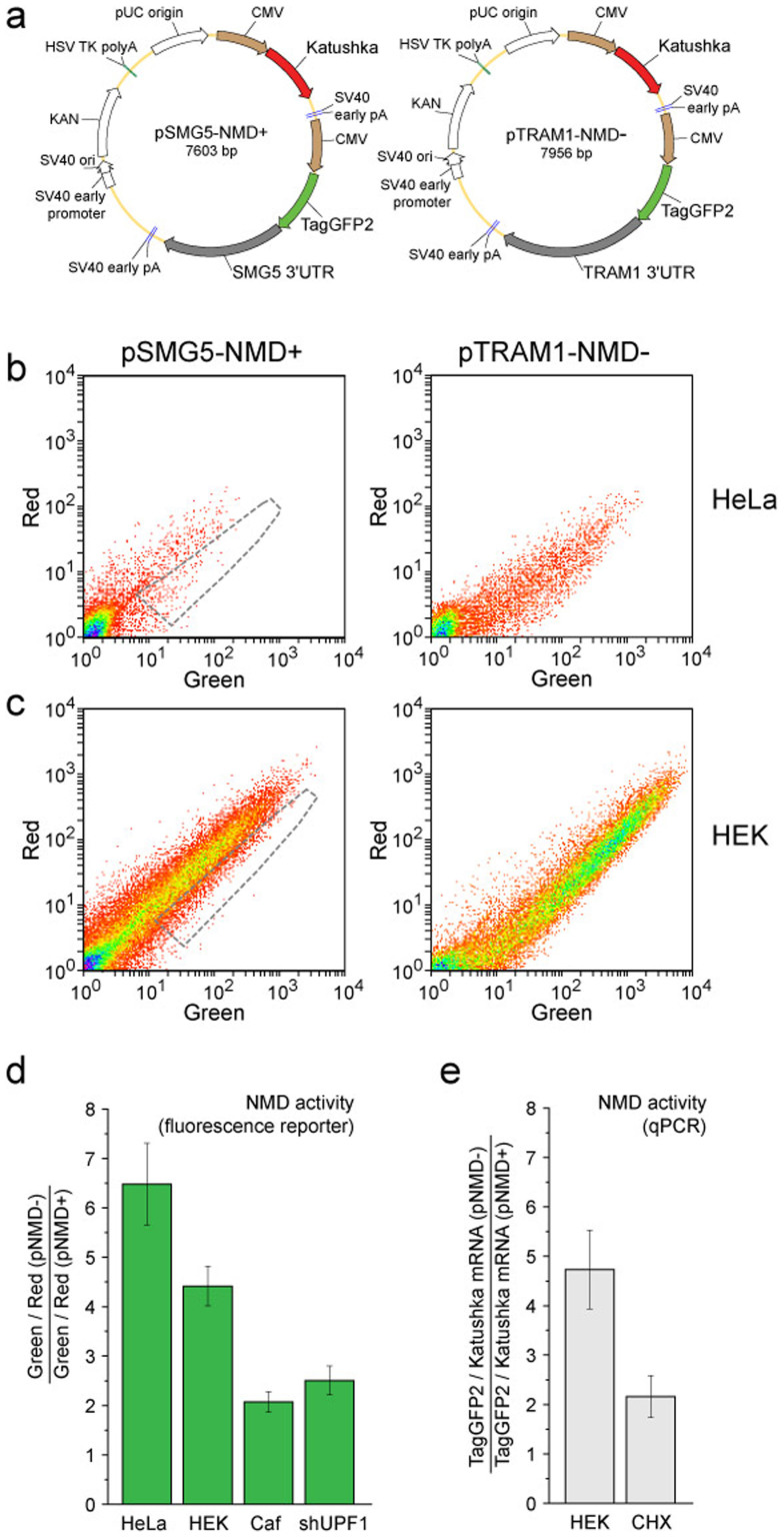 Figure 5. Long 3'UTR-dependent NMD reporter.(a) Main elements in the reporter vectors pSMG5-NMD+ (left) and pTRAM1-NMD− (right). Brown arrows – CMV promoters. Red arrows – Katushka coding region. Green arrows – TagGFP2 coding region. Grey arrows – 3'UTRs of SMG5 and TRAM1. (b,c) Flow cytometry analysis of HeLa (b) and HEK293T (c) cells transiently transfected with pSMG5-NMD+ (left plots) or pTRAM1-NMD− (right plots). Corresponding pairs of cell samples were analyzed using the same flow cytometer settings. The area of the corresponding NMD− cells is outlined by a gray dashed line on the NMD+ plots. (d,e) NMD activity in HeLa or HEK293T cells (untreated or treated with caffeine (Caf), anti-UPF1 shRNA (shUPF1) or cycloheximide (CHX)). Data were obtained by fluorescence reporter analysis (d) or qPCR (e). The mean data and standard deviation of at least 3 independent experiments are shown.