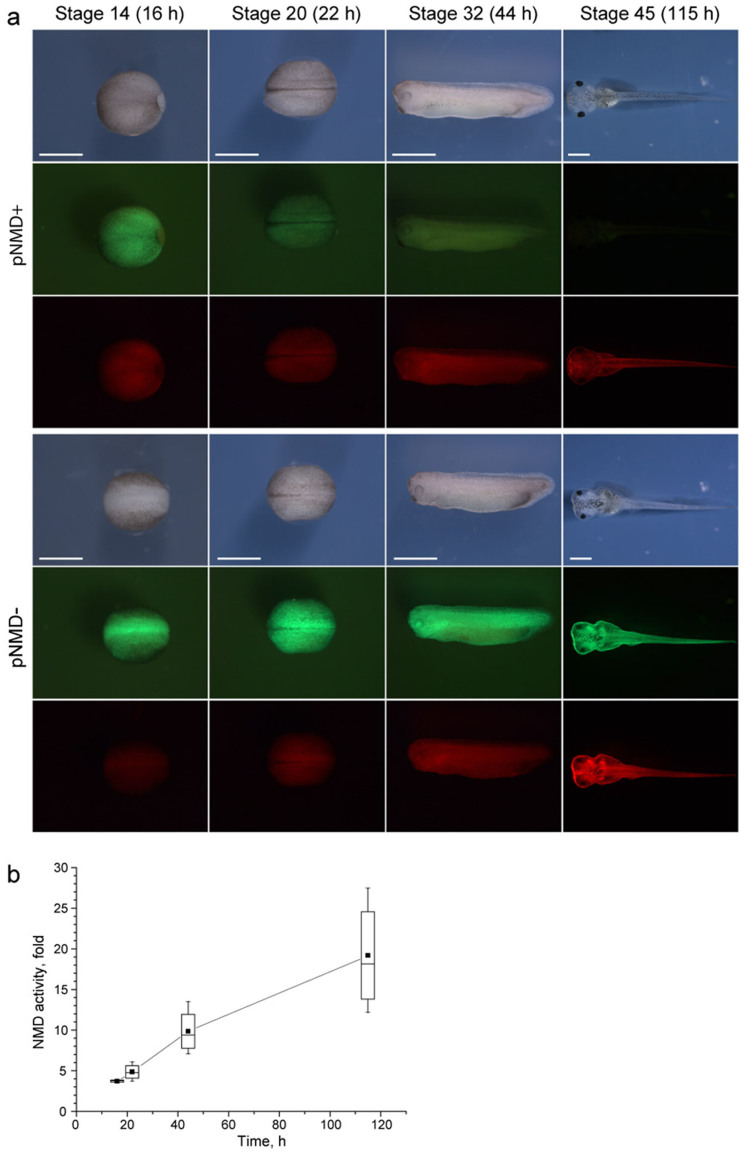 Figure 6. Splicing-dependent NMD reporter in developing Xenopus embryos.(a) Fluorescence microscopy of representative embryos expressing pNMD+ (upper panels) or pNMD− (bottom panels). Embryos were photographed in white light (upper rows) and the green (middle rows) and red (bottom rows) fluorescence channels. All embryos were imaged under the same settings, except those at stage 45, for which the exposures were decreased to avoid signal saturation. Scale bar: 1 mm. (b) The change of NMD activity during Xenopus development. Data for 7 embryos in 3 independent experiments are shown as a box plot (mean, median, standard deviation, and extrema).
