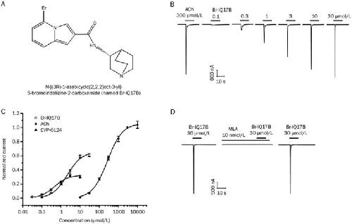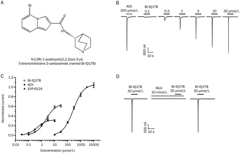 Figure 1. Chemical structure of Br-IQ17B and its dose-dependent activation of human α7 nAChR channels expressed in Xenopus oocytes. (A) Chemical structure of N-[(3R)-1-azabicyclo[2,2,2]oct-3-yl]-5-bromoindolizine-2-carboxamide, named Br-IQ17B, molecular weight of 348.24. (B) Representative α7 currents recorded from an oocyte expressing human α7 nAChR in response to 300 μmol/L ACh (a near half-maximal concentration) and increasing concentrations of Br-IQ17B (0.1–30 μmol/L). Oocytes were held at −90 mV, and traces were consecutively acquired with 7-min lapses. (C) Curve with open squares represents concentration-response relationship of inward α7 nAChR currents induced by Br-IQ17B. The maximal response evoked by Br-IQ17B is 64.3%±3.6% of ACh (3 mmol/L) with an EC50 of 1.8±0.2 μmol/L and a Hill coefficient of 1.2±0.1 (n=6 for all data points). Curve with fitted triangles represents concentration-response of EVP-6124 with an EC50 of 0.45±0.08 μmol/L and a Hill coefficient of 1.2±0.2 (n=6 for all data points). The maximal response compared to ACh is 30.6%±1.8%. Curve with fitted circles represents concentration-response of natural agonist ACh, yielding an EC50 of 284.2±14.6 μmol/L and a Hill coefficient of 1.1±0.1 (n=6 for all data points). Peak current amplitudes were measured and normalized to the current evoked by 3 mmol/L ACh. (D) The α7 current evoked by 30 μmol/L Br-IQ17B was inhibited by 10 nmol/L α7 antagonist MLA. The inhibitory effect could be reversed after a 10-min washout.