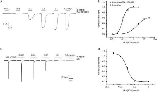 Figure 2. Dose-dependent activation of α7 current by Br-IQ17B agonist in the presence of the PAM PNU-120596 and desensitization induced by pre-incubation of Br-IQ17B. (A) Representative traces induced by increasing concentrations of Br-IQ17B co-applied with the selective α7 type II PAM PNU-120596 (1 μmol/L). Oocytes were held at −90 mV, and traces were consecutively acquired with 7-min lapses. (B) Concentration-peak current of α7 induced by Br-IQ17B in the presence of 1 μmol/L PNU-120596 and fitted by the Hill equation (line with open squares), with an EC50 of 93.6±6.5 nmol/L and a Hill coefficient of 2.4±0.1 (n=5 for all data points); partial activation of α7 by Br-IQ17B alone with EC50 of 1.8±0.2 μmol/L (line with filled circles). (C) Representative current traces depicting the response to ACh (100 μmol/L) after 1-min sustained exposure to low concentrations of Br-IQ17B (3–300 nmol/L). Oocytes were held at −90 mV, and consecutive acquisitions of traces were made with 7-min lapses. (D) Fitting of concentration-dependent inhibition of the ACh (100 μmol/L)-evoked response after sustained exposure to Br-IQ17B. Peak current amplitudes were measured and normalized with respect to the amplitude of current elicited by 100 μmol/L ACh alone. Data points were fitted to a Hill equation, yielding an IC50 of 28.5±1.9 nmol/L and a Hill coefficient of 2.8±0.3 (n=6 for all data points).