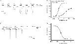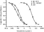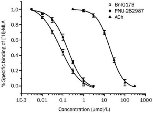 Figure 3. Displacement of [3H]-MLA ligand binding in crude membranes from rat brain. Displacement of the binding of the radio-ligand α7 antagonist [3H]-MLA to membranes of rat brain hippocampus in the presence of increasing concentrations of Br-IQ17B (line with open squares) and natural agonist ACh (line with filled triangles) with Kis of 14.9±3.2 nmol/L and 3.9±0.3 μmol/L, respectively. The line with filled circles shows the dose-dependent inhibition of [3H]-MLA binding by the orthosteric agonist PNU-282987 as positive control, yielding a Ki of 34.1±4.3 nmol/L.