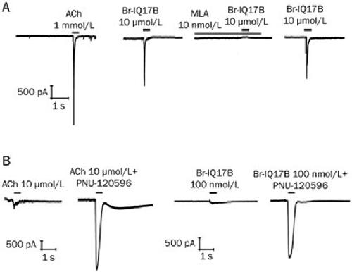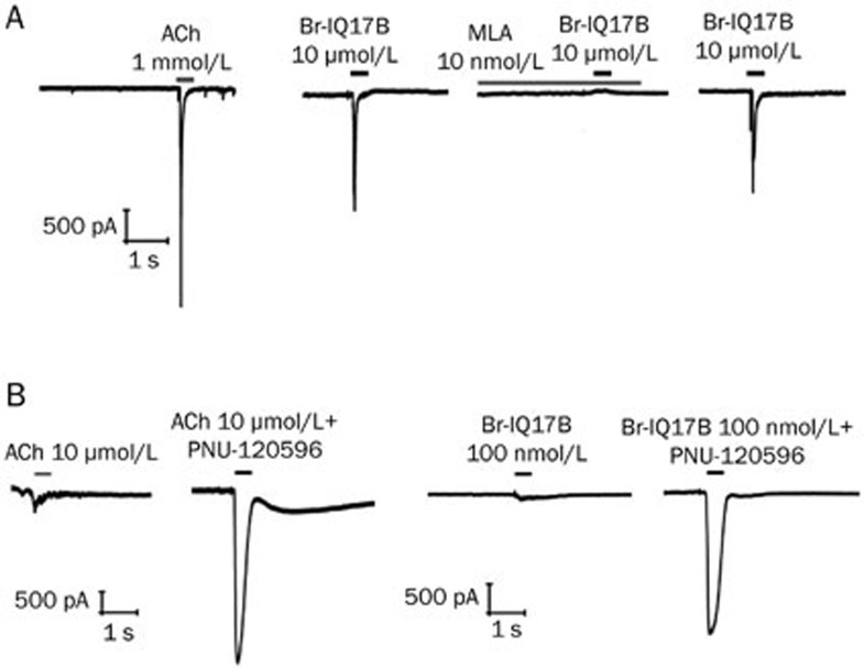 Figure 5. Activation of native α7 nAChR in hippocampal neurons by Br-IQ17B. (A) Representative current traces evoked by agonist ACh (1 mmol/L) and Br-IQ17B (10 μmol/L) in hippocampal neurons. The current elicited by Br-IQ17B was blocked by the inhibitor MLA (10 nmol/L) (n=3). The neurons were held at −80 mV. (B) Representative current traces evoked by a low concentration of ACh (10 μmol/L) or Br-IQ17B (100 nmol/L) in the presence or absence of PNU-120596 (1 μmol/L), respectively (n=3). Current induced by the co-application of Br-IQ17B (100 nmol/L) and PNU-120596 (1 μmol/L) is significantly larger than Br-IQ17B (100 nmol/L) alone. The neurons were held at −80 mV.
