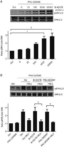Figure 6. Activation of α7 nAChR by Br-IQ17B enhances pERK signaling in PC12 cells. (A) In the upper panel, Western blot analysis of PC12 cells stimulated with different concentrations of Br-IQ17B (0.01â10 μmol/L) for 7 min after pre-incubation of 1 μmol/L PNU-120596 for 10 min. Lower panel, semi-quantitative analysis of pERK/tERK from upper panel data. Data were normalized to that of control without any treatment and expressed as the mean±SEM. Co-application of PNU-120596 (1 μmol/L) and Br-IQ17B significantly increased the ratio of phosphorylated ERK to total ERK (n=3, cP<0.01 vs control, paired t-test). (B) In upper panel, the Br-IQ17B-increased phosphorylation of ERK1/2 was blocked in the presence of the α7 blocker MLA. Western blot analysis of PC12 cells pretreated with or without 100 nmol/L MLA for 10 min followed by the addition of 1 μmol/L PNU-120596 and agonists (10 μmol/L for nicotine; 1 μmol/L for Br-IQ17B, and 1 μmol/L for PNU-282987). Lower panel, semi-quantitative analysis of pERK/tERK from upper panel data. Data were normalized to that of control without any treatment and expressed as the mean±SEM. MLA significantly reversed the increased ratio of phosphorylation ERK caused by either Br-IQ17B or PNU-282987 (n=3, bP<0.05, paired t-test).