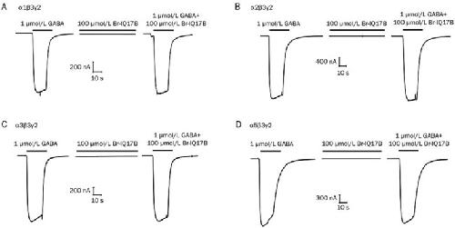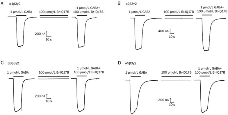 Figure 8. Selectivity assessments of Br-IQ17B on subtypes of GABAA receptors. Representative current traces recorded in oocytes expressing human α1β3γ2 (A), α2β3γ2 (B), α3β3γ2 (C), and α5β3γ2 (D) subtypes showing the lack of effects of Br-IQ17B on GABAA activity in the presence of 1 μmol/L GABA (left), 100 μmol/L Br-IQ17B (middle), or the co-application of GABA and Br-IQ17B (right) (n=3 for all subtypes).