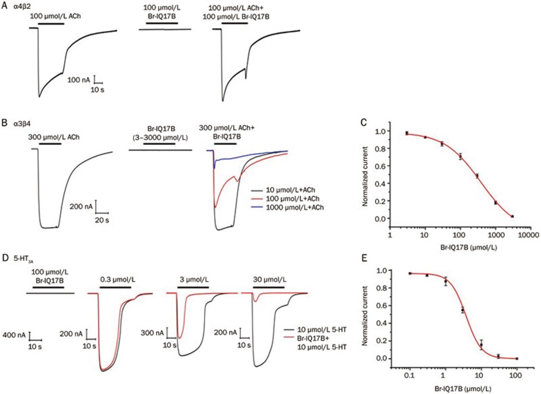 Figure 4. Selectivity assessments of Br-IQ17B. (A) Representative current traces showing the effects of Br-IQ17B on an oocyte expressing rat α4β2 nAChR in the presence of 100 μmol/L ACh (left), 100 μmol/L Br-IQ17B (middle), and the co-application of ACh and Br-IQ17B (right). (B) Representative current traces showing the effects of Br-IQ17B on an oocyte expressing α3β4 nAChR subunits in the presence of ACh (300 μmol/L) (left), or different concentrations (3–3000 μmol/L) of Br-IQ17B alone (middle), or the co-application of different concentrations of Br-IQ17B ranging from 3–3000 μmol/L (only 3 traces for concentrations of 10, 100 and 1000 μmol/L are shown) with a fixed concentration of ACh (300 μmol/L) (right). (C) Concentration-response curve for inhibition of Br-IQ17B on rat α3β4; the peak current amplitudes were plotted as a function of Br-IQ17B concentration (3–3000 μmol/L) normalized to ACh (300 μmol/L), with an IC50 of 381.5±28.6 μmol/L and a Hill coefficient of 0.9±0.1 (n=5 for all data points). (D) Representative current traces from oocytes expressing 5-HT3A receptors in response to 100 μmol/L Br-IQ17B alone (first trace), 10 μmol/L 5-HT alone, and the co-application of increasing concentrations of Br-IQ17B (0.3–30 μmol/L) with 5-HT (10 μmol/L). (E) Concentration-response relationship for antagonist properties of Br-IQ17B against human 5-HT3A; plot of the peak current as a function of the Hill equation of Br-IQ17B (0.1–100 μmol/L) and normalized to 5-HT (10 μmol/L), with an IC50 of 3.74±0.64 μmol/L and a Hill coefficient of 2.1±0.1 (n=6 for all data points).
