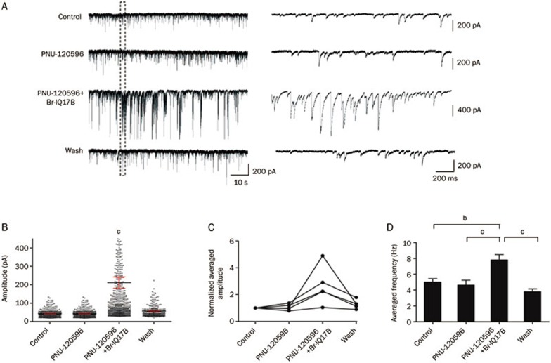 Figure 7. α7 nAChR agonist Br-IQ17B enhances GABAergic synaptic transmission. (A) Representative raw traces showing that Br-IQ17B (10 μmol/L) reversibly enhanced IPSC (inhibitory postsynaptic current) in the presence of PNU-120596 (1 μmol/L). Superfusion of PNU-120596 alone for 10 min had no detectable effect on spontaneous IPSC (sIPSC); further application of Br-IQ17B (10 μmol/L) increased both the frequency and amplitude of sIPSC. Enhanced sIPSC induced by the co-application of PNU-120596 and Br-IQ17B can be washed out. The area of the dashed rectangle (left panels) is expanded to show a faster timescale at right. The neurons were held at −70 mV. (B) Peak amplitude distributions of all IPSC events detected in the left panel of (A). Co-application of Br-IQ17B and PNU-120596 significantly increased IPSC amplitudes (cP<0.01, compared with control, PNU-120596 and wash, one-way ANOVA). (C) Normalized average IPSC peak amplitudes from all recordings. Co-application of Br-IQ17B and PNU-120596 increased IPSC amplitude of each individual neuron (n=5, record duration for 1 min, one-way ANOVA). (D) Statistical analysis of average IPSC frequency from all neurons recorded (n=6, record duration for 1 min). Co-application of Br-IQ17B and PNU-120596 significantly increased average IPSC frequency (bP<0.05 vs control, cP<0.01 vs PNU-120596 or wash, paired t-test).