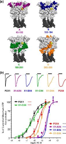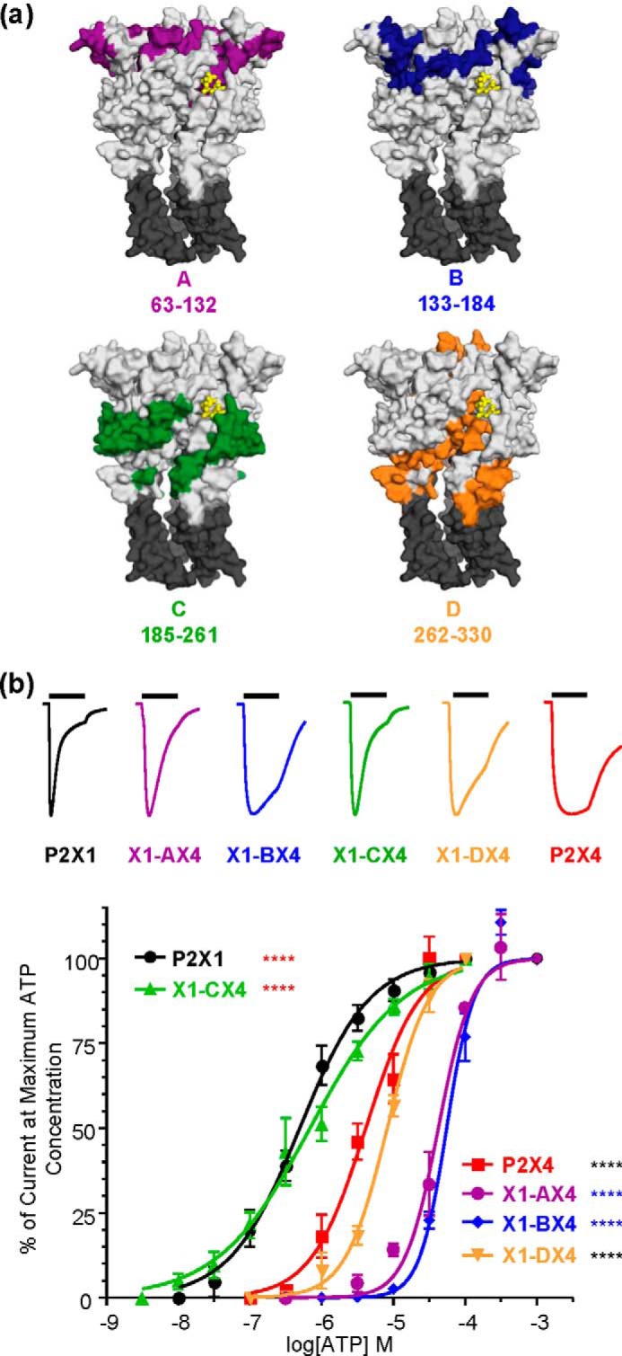 a, location of regions A–D on an ATP-bound homology model of the P2X1 receptor. Regions A–D are shown in color; ATP is shown in yellow. Transmembrane domains are shown in dark gray. b, upper, representative traces for WT and chimeric receptors at maximal ATP concentrations. The bars represent a 3-s ATP application. Traces have been normalized to peak currents to allow for comparison. Lower, concentration-response curves for ATP. Black asterisks indicate significant shifts in EC50 from the WT P2X1 receptor, red asterisks from the P2X4 receptor, and blue asterisks from both receptors. ****, p < 0.0001.