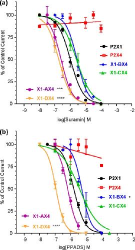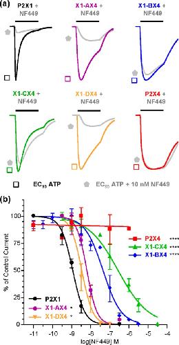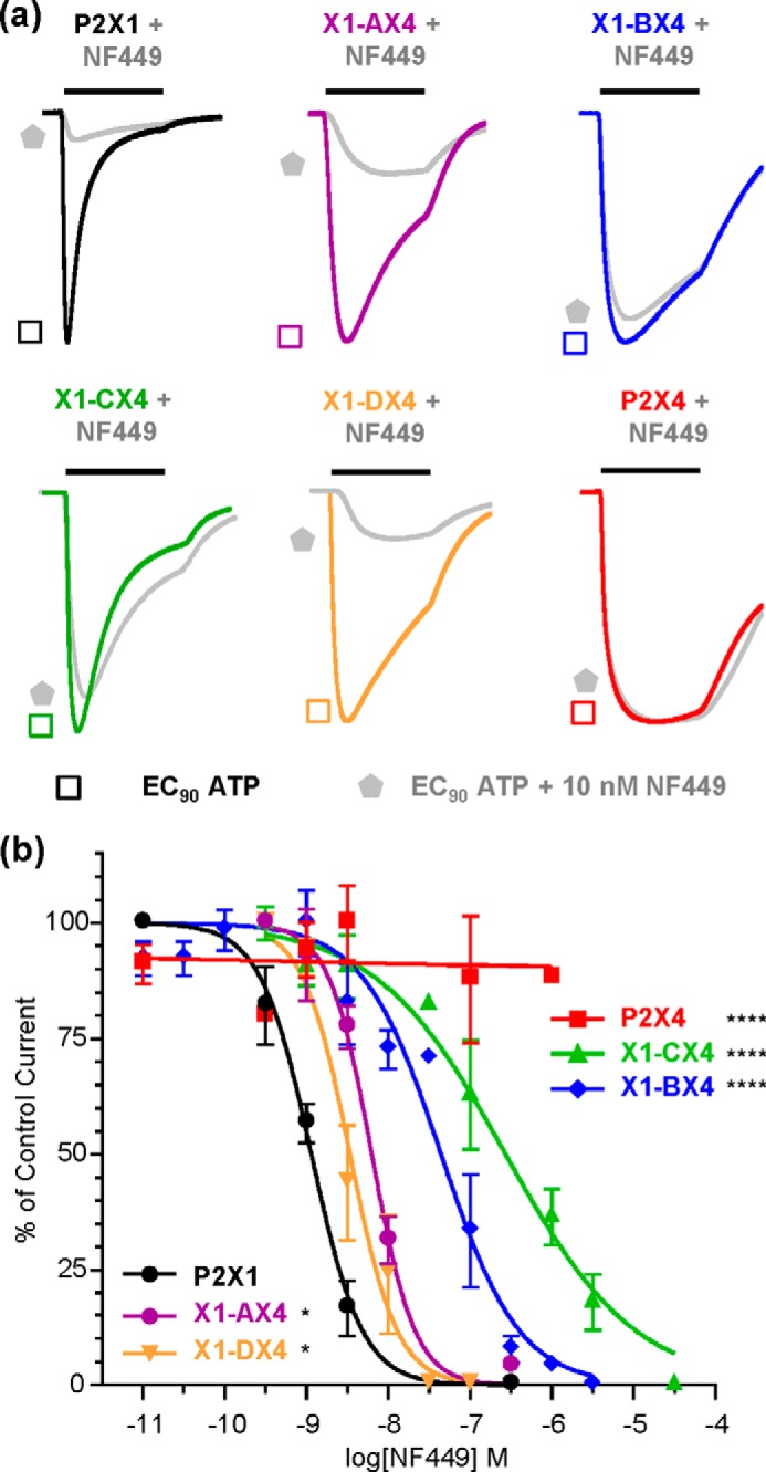 a, representative traces showing the effect of NF449 (10 nm) on currents evoked by an EC90 of ATP in Xenopus oocytes expressing WT and chimeric receptors. The bars indicate a 3-s agonist/antagonist application. b, NF449 inhibition curves at an EC90 of ATP. Asterisks indicate a significant shift in IC50 from the hP2X1 receptor. *, p < 0.05; ****, p < 0.0001.