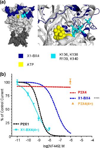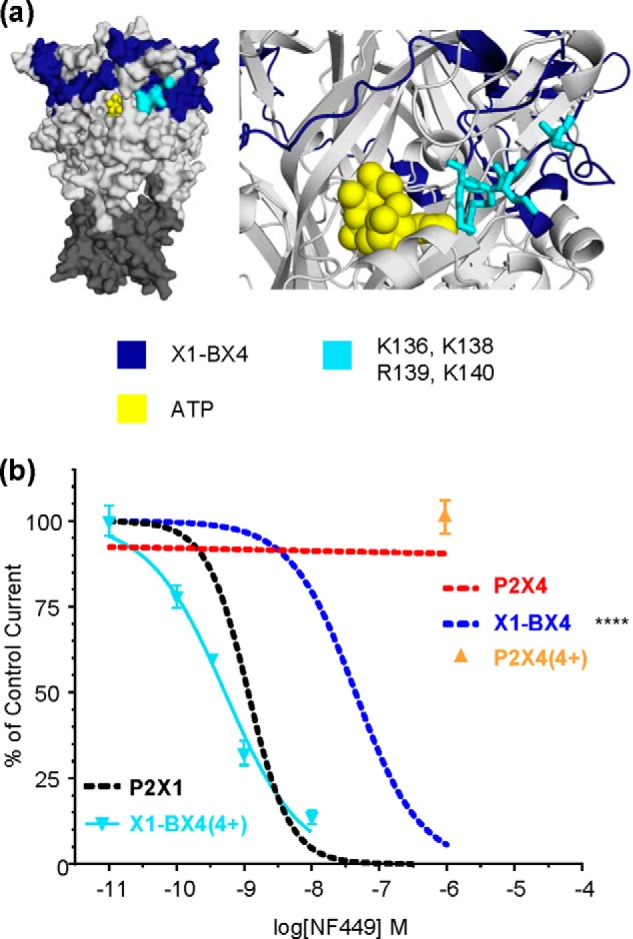 a, location of Lys-136, Lys-138, Arg-139, and Lys-140 in a P2X1 receptor homology model. Docked ATP is shown in yellow. b, NF449 inhibition curves showing the effect of reintroducing the positive charges to the X1-BX4 chimera and NF449 action in the P2X4(4+) receptor. Asterisks indicate a significant difference in IC50 compared with the P2X1 receptor. ****, p < 0.0001.
