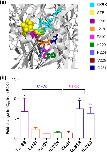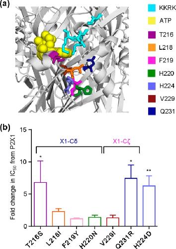 a, location of point mutated residues in a P2X1 receptor homology model. Docked ATP is shown in yellow. Residues were mutated to the equivalent residue of the P2X4 receptor. b, histogram showing the -fold change in NF449 inhibition compared with the WT P2X1 receptor at an EC90 of ATP. Asterisks represent a significant difference. *, p < 0.05; **, p < 0.01.