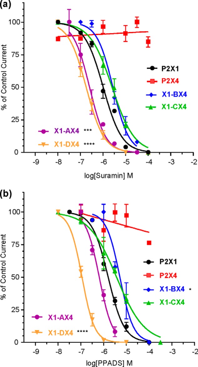 FIGURE 3. Suramin and PPADS antagonism at chimeric P2X receptors.