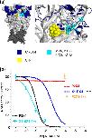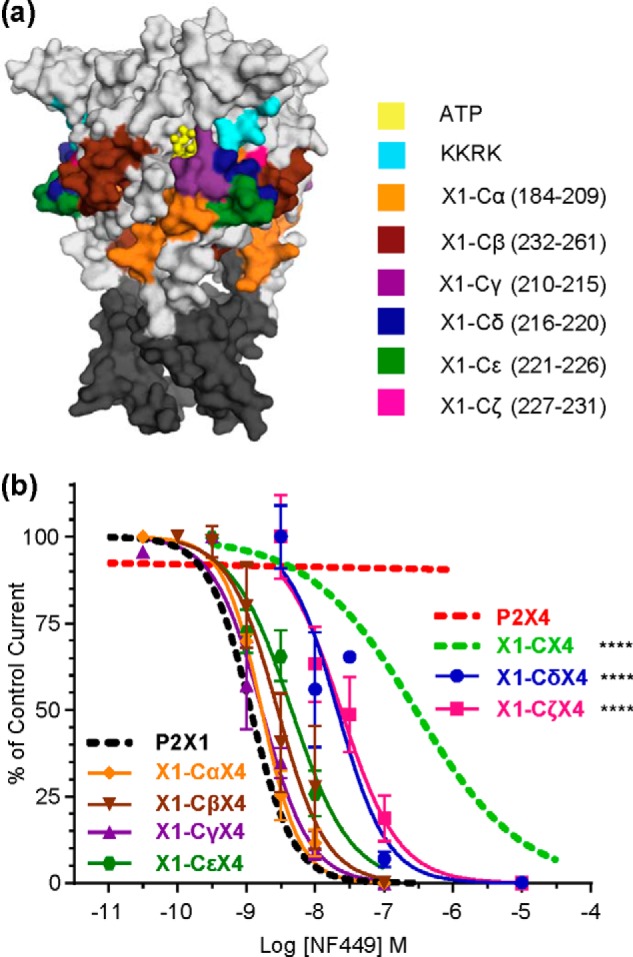 a, location of residues swapped to generate chimeras shown in a homology model of the P2X1 receptor. Docked ATP is shown in yellow, and transmembrane domains are shown in dark gray. b, NF449 inhibition curves for subchimeras. Curves were generated at an EC90 of ATP. Asterisks represent a significant difference in IC50 compared with the P2X1 receptor. ****, p < 0.0001.