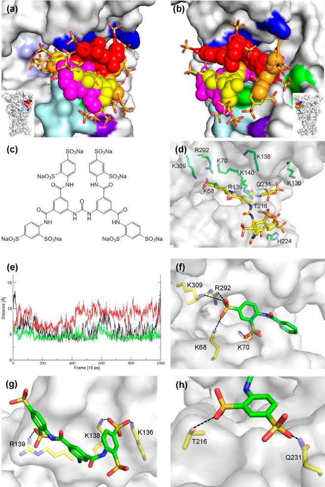 a and b, overlay of the four docking poses A–D on the P2X1 receptor shown from different angles. The P2X1 receptor is shown in surface representation, highlighting the positively charged residues of the ATP-binding site (Lys-68, Lys-70, Arg-292, and Lys-309) in light blue, the positively charged residues of the cysteine-rich head region (Lys-136, Lys-138, Arg-139, and Lys-140) in dark blue, Thr-216 and Gln-231 in green, region X1-CγX4 (residues 210–215; see “Results”) in pale cyan, and His-224 in purple. NF449 poses A (red), B (orange), C (pink), and D (yellow) are shown as a mixture of sphere representation (for the core of the poses) and stick representation (for the arms of the poses). All four poses bind to the cleft between the cysteine-rich head region, ATP-binding site, and dorsal fin. c, molecular structure of the NF449 sodium salt. d, snapshot of NF449 from the pose C trajectory. NF449 and residues Lys-68, Lys-70, Lys-136, Lys-138, Arg-139, Lys-140, Thr-216, His-224, Gln-231, Arg-292, and Lys-309 are shown in stick representation. e, distances between NF449 sulfonate sulfur atoms and His-224 Nϵ (black), Thr-216 Oγ (green), and the amide nitrogen of Gln-231 monitored over the 10-ns molecular dynamics simulation of pose C. NF449/His-224 and NF449/Thr-216 interactions are present in most of the frames, and NF449/Gln-231 interactions are less stable in this simulation and are present only between 1.5 and 4.5 ns. f, section of NF449 pose C interacting with the ATP-binding site. Potential salt bridges are indicated by dashed black lines. g, section of NF449 pose A and residues Lys-136, Lys-138, and Arg-139 of the cysteine-rich head region. h, arm of NF449 pose D forming H-bonds with Thr-216 and Gln-231 side chains.