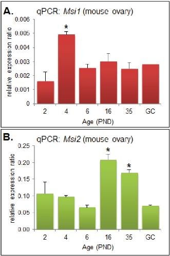 Figure 1. Quantitative PCR (qPCR) Analysis of Musashi during ovary maturation. (A) QPCR of Msi1 in ovary time-course from post-natal day (PND) 2 through to sexual maturity at PND35 and in isolated granulosa cells (GC). MRNA expression relative to Cyclophilin A (2eΔCt); values are mean + SEM; (ovary: n = 3, GC: n = 2). (B) QPCR of Msi2 in ovary time-course from PND 2 through to PND35 and in isolated granulosa cells (GC). Fold change relative to Cyclophilin A (2eΔCt); values are mean + SEM; (ovary: n = 3, GC: n = 2).