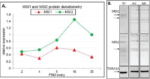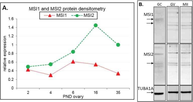 Figure 2. Immunoblot analysis of Musashi during ovary maturation. (A) Protein densitometry of full-length MSI1 and MSI2 in ovary time-course from post-natal day (PND) 2 through to sexual maturity at PND35. Protein expression relative to TUBA1A. For original immunoblots see Supplemental Figure S2. n = 1. (B) Immunoblot of MSI1 and MSI2 in isolated granulosa cells (GC), germinal vesicle oocytes (GV), and in vitro matured metaphase II oocytes (MII). Positive expression of MSI1 was detected at the appropriate size of 39 kDa for isoform 1 and 34 kDa for isoform 2 (only in oocytes). Positive expression of MSI2 was detected at ~37 kDa. Protein expression was measured relative to TUBA1A loading control at 55 kDa. For immunoblots with molecular weight marker, see Supplemental Figure S2.