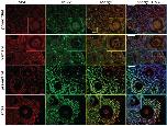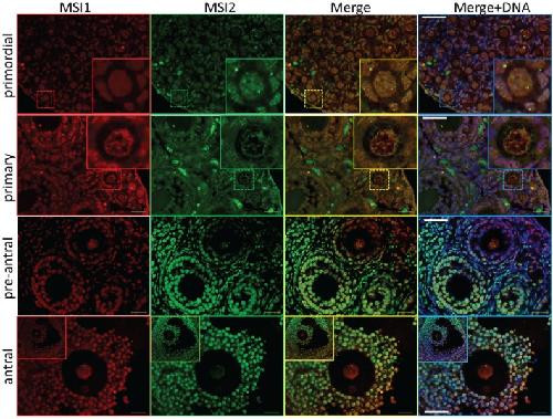 Figure 3. Immunolocalization of Musashi during ovary maturation. Mouse ovary sections were probed for antibodies against MSI1 (red) and MSI2 (green), and counter-stained with DNA marker DAPI (blue). Based on ovary age and follicle composition, images were classified developmentally into primordial, primary, pre-antral, and antral. Sections were visualized via epifluorescent microscopy. Insets in primordial and primary sets show zoomed image of follicle-type. Scale bar in merged images = 40 μm.