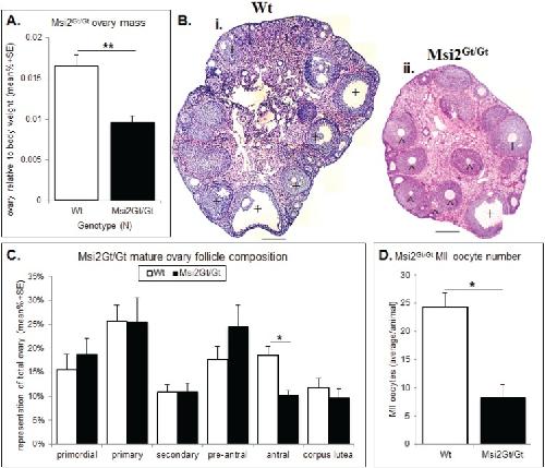Characterizing the mechanisms underlying follicle development in the ovary is crucial to understanding female fertility and is an area of increasing research interest. The RNA binding protein Musashi is essential for post-transcriptional regulation of oocyte maturation in Xenopus and is expressed during ovarian development in Drosophila. In mammals Musashi is important for spermatogenesis and male fertility, but its role in the ovary has yet to be characterized. In this study we determined the expression of mammalian Musashi proteins MSI1 and MSI2 during mouse folliculogenesis, and through the use of a MSI2-specific knockout mouse model we identified that MSI2 is essential for normal follicle development. Time-course characterization of MSI1 and MSI2 revealed distinct differences in steady-state mRNA levels and protein expression/localization at important developmental time-points during folliculogenesis. Using a gene-trap mouse model that inactivates Msi2, we observed a significant decrease in ovarian mass, and change in follicle-stage composition due to developmental blocking of antral stage follicles and pre-antral follicle loss through atresia. We also confirmed that hormonally stimulated Msi2-deficient mice produce significantly fewer MII oocytes (60.9% less than controls, p < 0.05). Furthermore, the majority of these oocytes are of poor viability (62.2% non-viable/apoptotic, p < 0.05), which causes a reduction in female fertility evidenced by decreased litter size in Msi2-deficient animals (33.1% reduction to controls, p < 0.05). Our findings indicate that MSI1 and MSI2 display distinct expression profiles during mammalian folliculogenesis and that MSI2 is required for pre-antral follicle development.