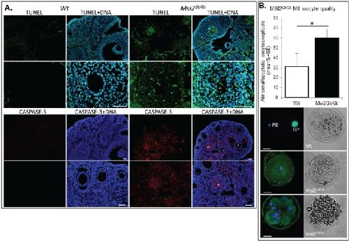 Figure 6. Assessment of Msi2Gt/Gt ovarian and oocyte health. (A) Immunofluorescence of TUNEL and CASPASE-3 in Msi2Gt/Gt and Wt adult ovary. Representative images demonstrate an increase in TUNEL (green) and CASPASE-3 (red) in Msi2Gt/Gt pre-antral (^) and antral (+) follicles, verified via quantitative analysis n = 4. Scale bar = 50 μm; (B) Msi2Gt/Gt and Wt MII oocyte quality. MII oocytes collected from the oviductal ampullae of super-ovulated adult mice were fixed and subjected to immunocytochemistry for α-tubulin (green) to identify spindles and Hoechst (blue) to identify polar body DNA and oocyte chromosomes. Representative images show typical MII staining pattern in Wt depicting polar body (PB) formation and normal chromosome and spindle alignment (SP). Msi2Gt/Gt images depict irregular spindle assembly and chromosome alignment and oocyte apoptosis. n = 3 biological replicates, 3 mice/replicate, *: denotes p < 0.05. Scale bar = 20 μm.