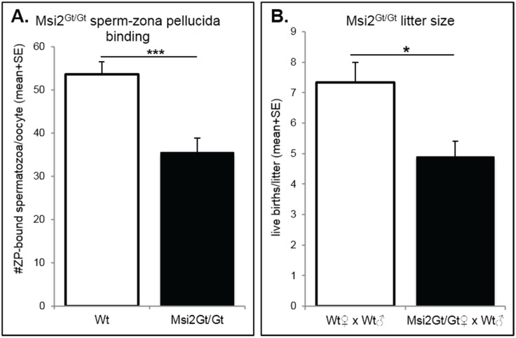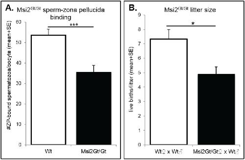 Figure 7. Assessment of Msi2Gt/Gt fertility. (A) Sperm-zona pellucida binding in Msi2Gt/Gt (n = 8) and Wt (n = 9) MII oocytes. MII oocytes were collected from the oviductal ampullae of super-ovulated adult mice and subjected to sperm zona-binding with capacitated mature epididymal spermatozoa from control adult males. Following incubation and washing, the number of sperm that remained bound to the zona pellucida was counted. ***: denotes p < 0.001. (B) Average litter size in Msi2Gt/Gt and Wt females. Breeding pairs were assembled, following genotyping, at ~5 weeks and pairs were kept together for up to 6 months. The average number of live births per litter was recorded. n = 3 individual Wt × Wt breeding pairs, n = 10 individual Msi2Gt/Gt (female) and Wt (male) pairs. * denotes p < 0.05.