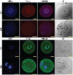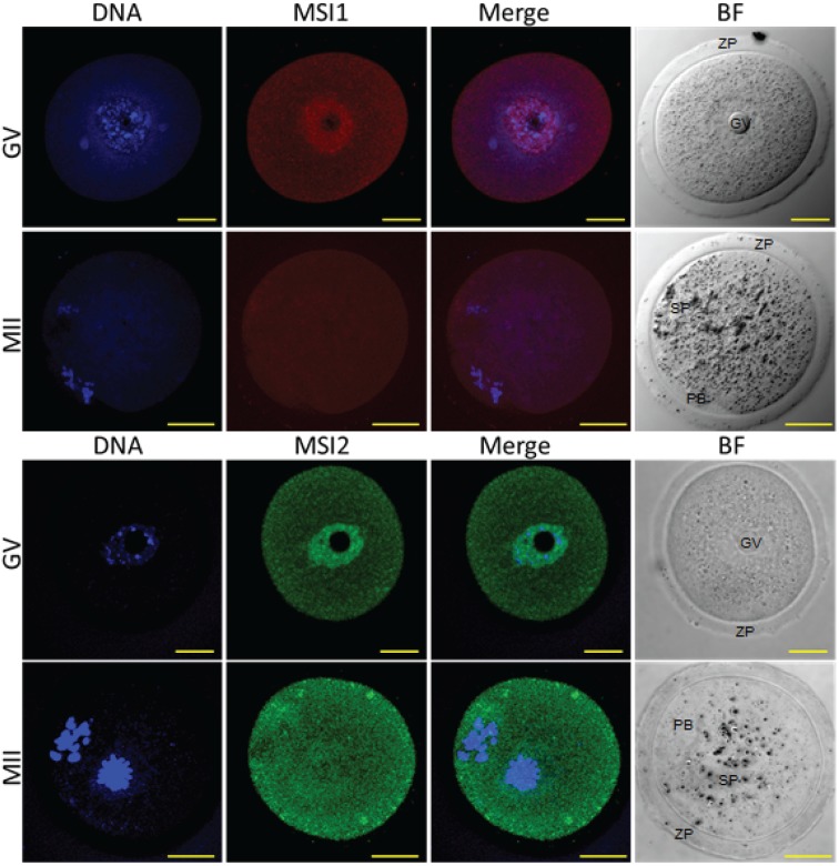 Figure 4. Immunocytochemistry of Musashi in germinal vesicle (GV) and metaphase II (MII) oocytes. Mouse oocytes were probed for antibodies against MSI1 (red) and MSI2 (green), and counter-stained with DNA marker Hoechst (blue). Representative images show Z-stack of total oocyte. Bright-field (BF) images were taken alongside confocal immunofluorescent microscopy. In BF images GV = germinal vesicle, ZP = zona pellucida, PB = polar body, SP = MII spindle. Scale bar = 20 μm. Consistent for n = 10.