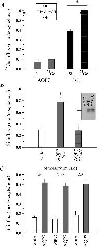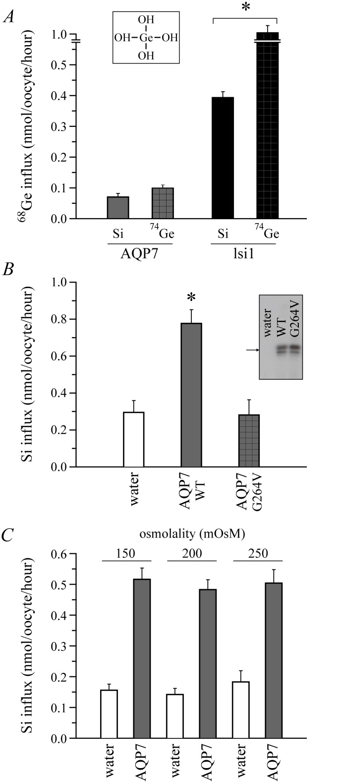 Fig 2. Control Si transport studies in AQP-expressing Xenopus laevis oocytes.(A) 68Ge influx. Oocytes incubated for 90 min in B1 medium (see Table 2) + 2 mM H4GeO4 with 1 μCi/mL H468GeO4 in or + 2 mM H4SiO4 were assayed for 68Ge content. Data correspond to background-subtracted influx values and are presented as means ± S.E. of 12 oocytes among 3 experiments. They were significantly different relative to background, between channels (for a given substrate) and between substrates (for lsi1). The image inserted on the top is to show the chemical structure of H4GeO4. (B) Si influx in AQP7G264V-expressing oocytes. Channels were tagged at the N-terminus with the epitope c-Myc. Conditions were as described for Fig 1A except that 2 mM sulfo-NHS was added to B1 medium in certain studies. Data are presented as means ± S.E. of 3 measurements among 6–7 experiments using * to indicate that they are significantly different compared to the controls. The image inserted on the right shows that the abundance and migration pattern of cell surface AQP7G264V by Western blot analysis are similar to those of wild type AQP7. (C) Dependence of Si influx on external osmolality (or on net water transport). Oocytes incubated for 90 min in a modified B1 medium (B2a, B2b or B2c) were assayed for Si content. Data are presented as means ± S.E. of 3 measurements among 6 experiments. Influx values among conditions are not significantly different. Under isotonic conditions, cell volumes after 20 s were also similar (885 ± 72 vs. 791 ± 97 nL). Abbreviation: WT, wild type.