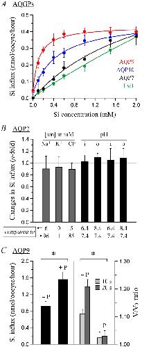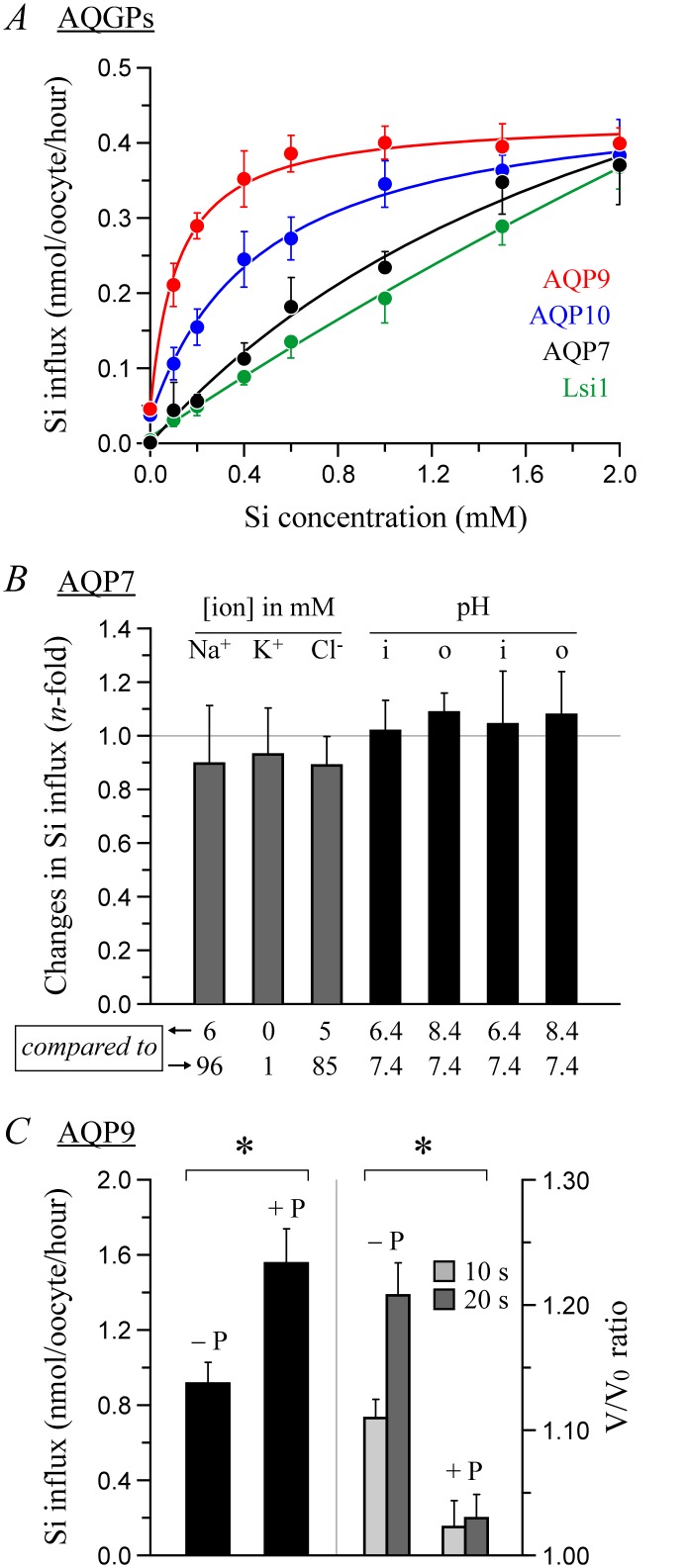 Fig 3. Characteristics of Si transport by AQP-expressing Xenopus laevis oocytes.(A) Dependence of Si influx on [H4SiO4]. Oocytes incubated for 30 min (AQP9), 60 min (AQP10) or 90 min (AQP7 and lsi1) in B1 medium (see Table 2) + 0 to 2 mM H4SiO4 were assayed for Si content. Data are expressed as background-subtracted influx values and are presented as means ± S.E. of 3 measurements among 3–5 experiments. (B) Dependence of Si influx on intracellular pH and on extracellular pH, [Na+], [K+], and [Cl−]. Oocytes incubated for 90 min in a modified B1 medium (called medium B3a, B3b, B3c, B3d or B3e) + 2 mM H4SiO4 were assayed for Si content. Data are expressed as n-fold differences and presented as means ± S.E. of 3 measurements among 6 experiments. None of the data are significantly different from 1. (C) Effect of phloretin on Si influx and water transport. Left scale: Oocytes incubated for 30 min in B2a medium + 2 mM H4SiO4 ± 0.1 mM phloretin were assayed for Si content. Data are expressed as background-subtracted influx values and presented as means ± S.E. of 3 measurements among 6 experiments. Right scale: Oocytes were assayed for cell volume during a 20-s incubation in ~10 mM sucrose ± 0.1 mM phloretin. Data are expressed as n-fold increases in cell volumes (V) relative to initial cell volumes (V0) and presented as means ± S.E. of 5 oocytes among 4 experiments. * indicates that the values are significantly different between − P and + P. Abbreviations: i, intracellular; o, extracellular; + P, phloretin.