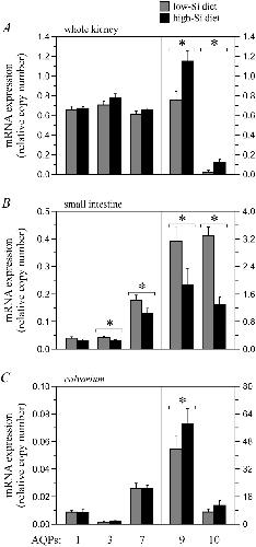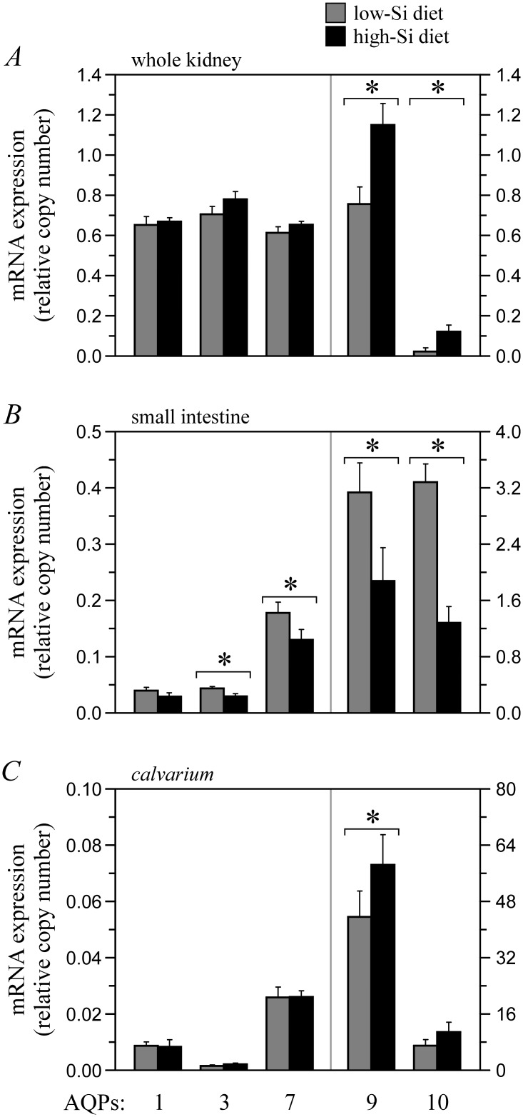 Fig 5. Effect of high- and low-Si diets on AQP transcription in selected mouse tissues.Animals were subjected to a Si-rich diet (4% elementary Si; n = 9) or a Si-poor diet (0.4% elementary Si; n = 8 or 9) for 3 weeks and sacrificed afterwards to carry out qPCR studies using total RNA from kidney (panel A), small intestine (panel B) or calvarium (panel C) as templates. Oligonucleotides used are shown in Table 1. Data are expressed as AQP-specific DNA copy numbers normalized to GADPH-specific DNA copy numbers and presented as means ± S.E. of 8–9 mice between two experiments using * to indicate that they are significantly different compared to each other. Of notice, relative AQP1 expression levels were lower than expected based on the data of Table 3 so that conditions used to amplify this isoform might have been suboptimal. Under the Si-rich diet, in addition, blood and urine [Si] were over 10-fold higher compared to the Si-poor diet.