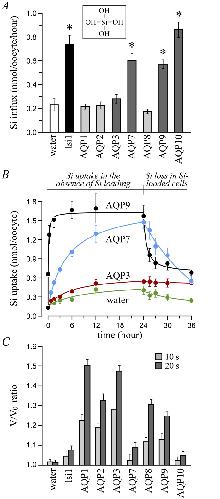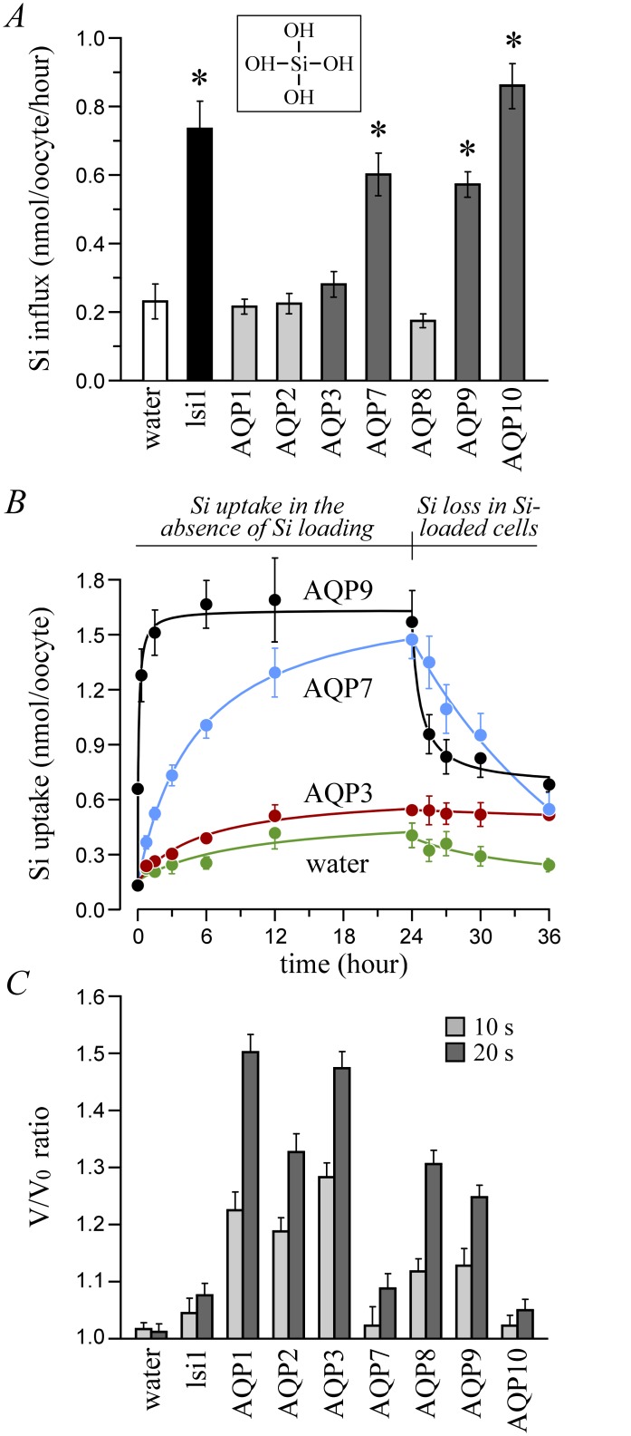 Fig 1. Standard Si transport studies in Xenopus laevis oocytes.(A) Si influx. Oocytes incubated for 30 min (AQP9), 60 min (AQP10) or 90 min (lsi1 and other AQPs) in B1 medium (see Table 2) + 2 mM H4SiO4 were assayed for Si content. Data are presented as means ± S.E. of 3 measurements among 4 experiments using * to indicate that they are significantly different compared to the controls. The image inserted on the top is to show the chemical structure of H4SiO4. (B) Si uptake and loss vs. time. Oocytes incubated for 0 to 36 h in B1 medium (± 2 mM H4SiO4 from 0 to 24 h and no H4SiO4 from 24 to 36 h) were assayed for Si content. Data are presented as means ± S.E. of 3 measurements among 5 or more experiments. Compared to the controls, data for AQP7 and AQP9 are all significantly different beyond the zero point, and data for AQP3 are all significantly different from 6 to 36 h. (C) Water transport. Oocytes were assayed for cell volume measurements during a 20-s incubation step in distilled water added with ~10 mM sucrose. Data are expressed as n-fold increases in cell volumes (V) relative to initial cell volumes (V0) and are presented as means ± S.E. of 5 oocytes among 3 experiments. They are all significantly different compared to the controls at 20 s.