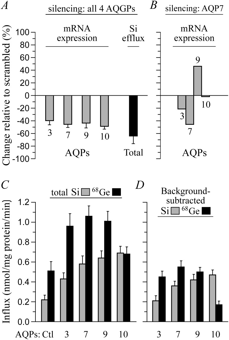 Fig 4. AQP expression and Si transport in HEK-293 cells.(A) Effect of anti-AQP3, AQP7, AQP9 and AQP10 siRNAs on AQPG expression and Si efflux. HEK-293 cells incubated for ~48 h in R medium (see Table 2) + 2 mM H4SiO4 ± 5 different siRNAs and for 5 additional min in R medium alone were assayed for AQP expression by qPCR and for Si content. Data are expressed as % changes between conditions “scrambled siRNAs” and “anti-AQP siRNAs” and are presented as means ± S.E. of 2–8 measurements among 3 experiments. All of the changes are significantly different from 0. Note that threshold cycles in the absence of siRNAs were of ~30 for all the AQGPs. (B) Effect of anti-AQP7 siRNAs on AQPG expression. Protocols used and data expression are as described for panel A. Except for AQP10, all of the changes are significantly different from 0. (C) Total Si and 68Ge influx. AQGP-transfected HEK-293 cells incubated for 5 min in R medium + 2 mM H4GeO4 with 1 μCi/mL H468GeO4 or in R medium + 2 mM H4SiO4 were assayed for both 68Ge or Si content, respectively. Data are expressed as mean influx values ± S.E. of 4–8 measurements among 3–5 experiments. Compared to the controls, all of the values are significantly different. (D) Background-subtracted 68Ge and Si influx. Influx values measured in pCDNA-transfected HEK-293 cells were subtracted from the influx values measured in AQGP-transfected HEK-293 cells. All values are significantly different from 0.