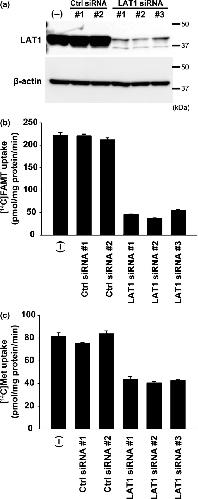 Figure 4. Effect of LAT1 knockdown on the uptake of [14C]FAMT and l‐[14C]methionine in HeLa S3 cells. HeLa S3 cells were transfected with LAT1 siRNA (LAT1 siRNA#1, #2, #3) or non‐targeting control siRNA (Ctrl siRNA#1, #2) and compared with non‐treated control (“(−)”). Knockdown of LAT1 with siRNA highly reduced LAT1 protein level in HeLa S3 cells in western blot (a). Accordingly, [14C]FAMT uptake was decreased by the treatment with LAT1 siRNA (b). The uptake of l‐[14C]methionine (Met) was also reduced, although the reduction of [14C]methoinine uptake by LAT1 knockdown was less than that of [14C]FAMT uptake (c). Control siRNA did not affect the levels of LAT1 protein and the uptake of [14C]FAMT and l‐[14C]methionine (a–c).