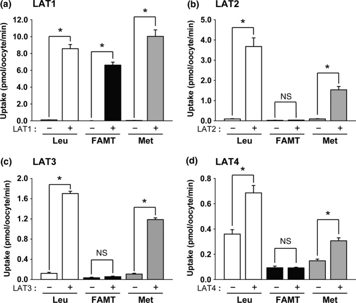Figure 1. [14C]FAMT transport by system L transporters. The uptakes of 50 μM [14C]FAMT (FAMT) and l‐[14C]methionine (Met) as well as a typical substrate l‐[14C]leucine (Leu) (50 μM) were measured for 15 min for LAT1 (a), LAT2 (b) and LAT3 (c), and for 30 min for LAT4 (d). The uptakes were measured in Na+‐free uptake buffer on the control oocytes (“−”) and the oocytes expressing each transporter (“+”). The uptake rates were expressed as mean ± SEM (n = 8–12). *P < 0.05; n.s., not significant.