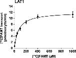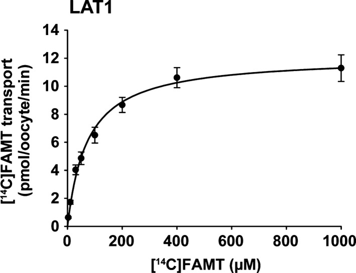Figure 3. Concentration dependence of [14C]FAMT transport. Concentration dependence of [14C]FAMT transport mediated by LAT1 was determined. LAT1‐mediated transport of [14C]FAMT at each concentration was measured for 15 min in Na+‐free uptake buffer. Transport rates were expressed as means ± SEM (n = 7–9) and fit to Michaelis–Menten curve.