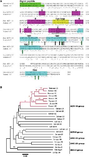 +. Black (and black outline) arrows are residues affecting α7 receptor desensitization. Residues in C‐binding loop of α7 nAChRs that bind α‐BTX are highlighted in grey. (B) Distance tree showing relationships of ACR‐16 homologues in parasitic nematode species with AChR subunit sequences from C.elegans. A neighbour joining tree was generated with deduced amino acid sequence from AChR subunits representative from the ACR‐16, ACR‐8, UNC‐38, UNC‐29 and DEG‐3 group as defined by Mongan et al., (1998). Three letter prefixes in AChR subunit names: Ace, Asu, Cel, Hco, Llo, Nam, Sra and Tca, refer to A. ceylanicum, A. suum, C. elegans, H. contortus, L. loa, N. americanus, S. ratti and T. canis respectively. ACR‐16 orthologues are highlighted in red. Numbers at each branch indicate percentage bootstrap values (>80%) corresponding to 1000 replicates. The scale bar represents substitutions per site. The Cel‐lgc‐30 subunit sequence was used as an outgroup.