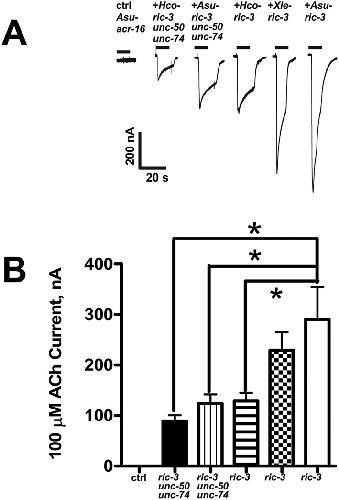 Figure 3. Effects of the ancillary proteins, RIC‐3, UNC‐50 and UNC‐74, from different nematode species, on Asu‐ACR‐16 expression. (A) Sample traces represented as inward currents produced in response to 100 μM ACh. (B) Bar chart (mean ± SEM) showing (left to right) current (in nA) generated in response to 100 μM ACh produced. Control (ctrl): Asu‐acr‐16 alone (n = 21). Black bar: Asu‐acr‐16 plus Hco